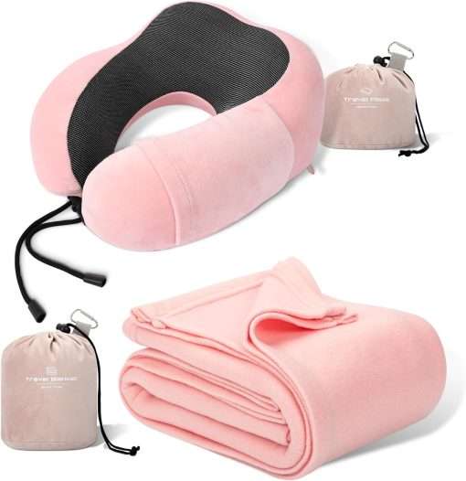 Pink Travel Neck Pillow and Blanket Set for Airplane Travel Essentials Womens Memory Foam Neck Pillow and Compact Soft Airplane Blanket with Bag for Traveling Airport Car Sleeping