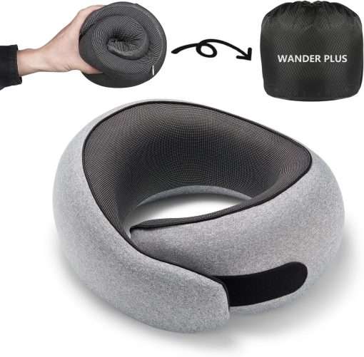 WANDER PLUS® Travel Pillow, 100% Pure Memory Foam Travel Neck Pillow Airplane Neck Support Ergonomic Design Best for Sleeping Plane Car Train Office Flight for Adults Grey